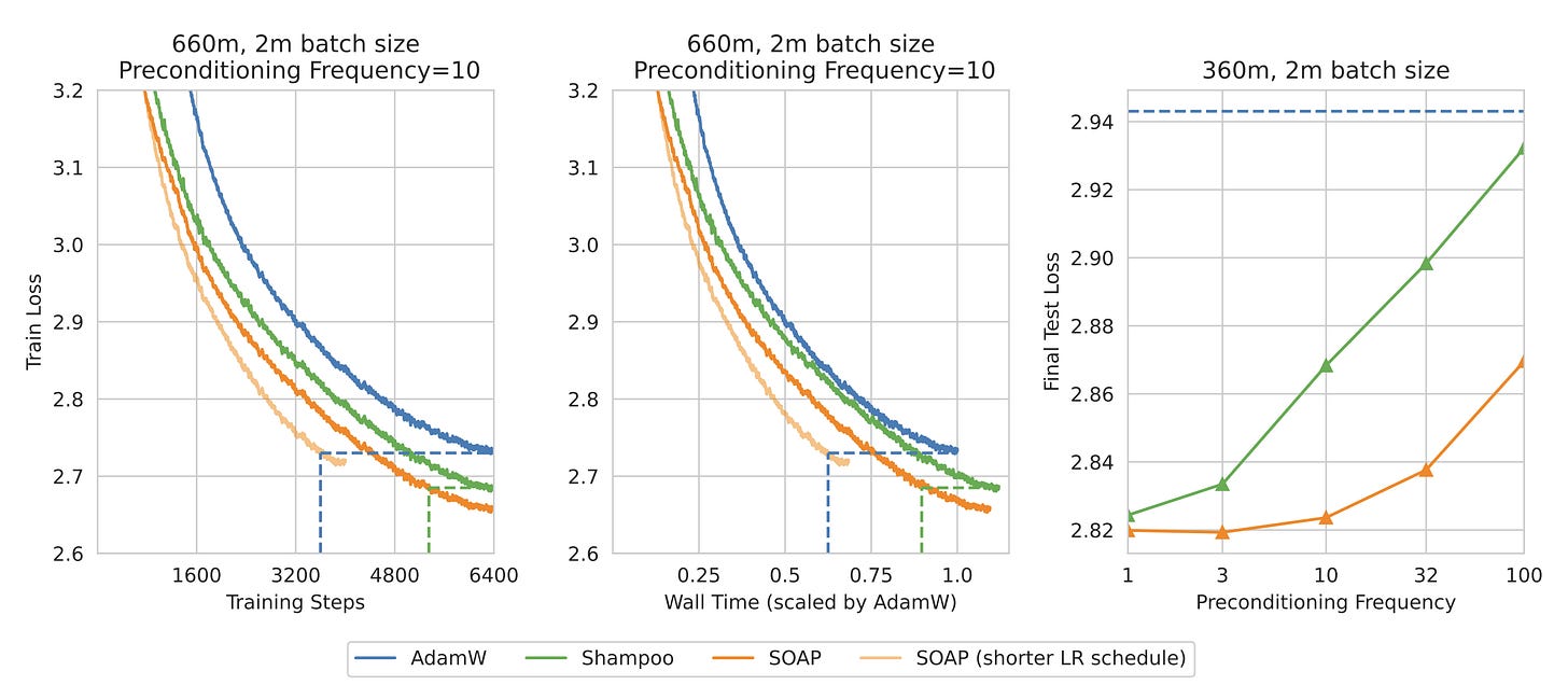 Reduced Computational Cost: SOAP drastically reduces computational overhead compared to Shampoo by updating the preconditioner less frequently.